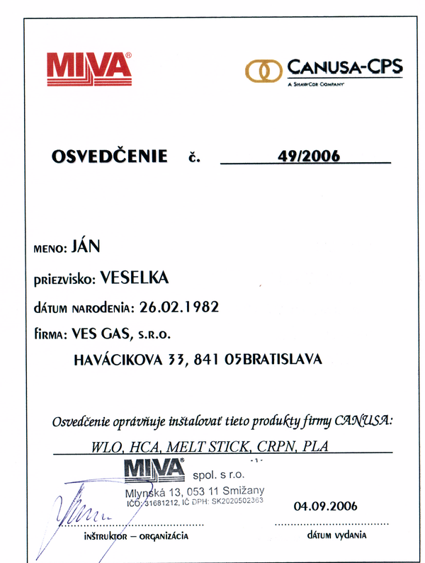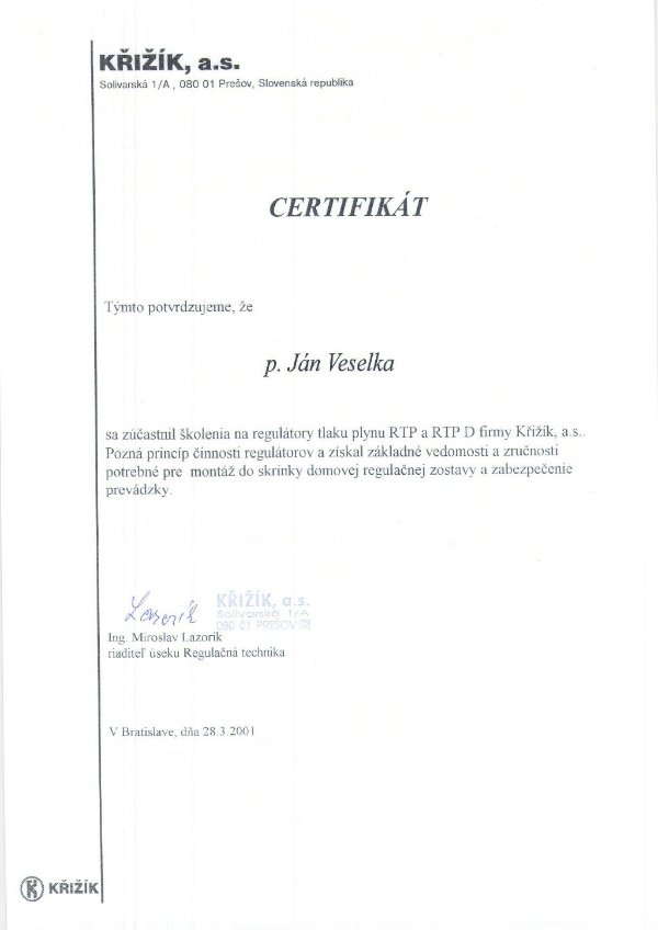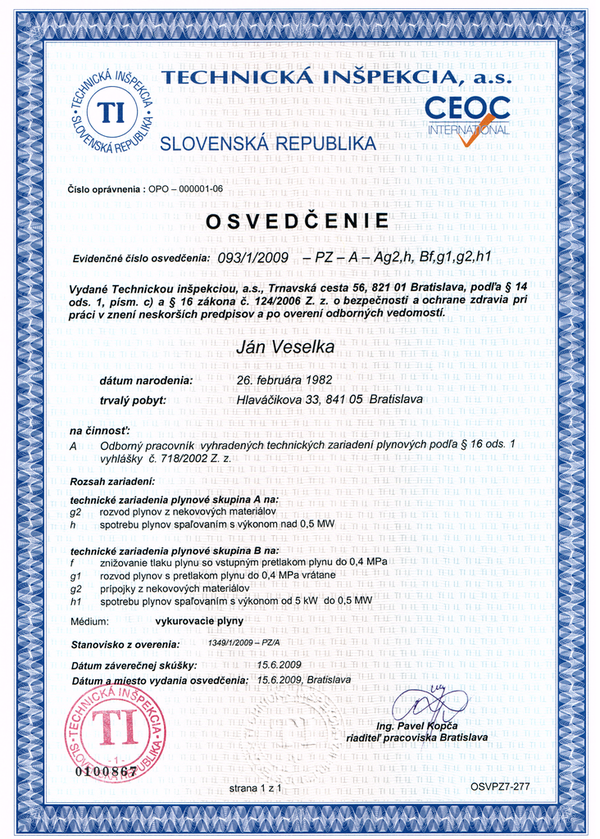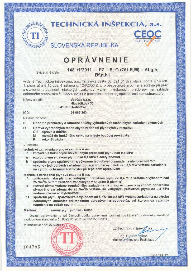 Oprávnenie "Riadiť práce pri opravách alebo samostatne opravovať vyhradené technické zariadenie plynové podľa paragrafu 18 vyhlášky č. 718/2002 Z.z."