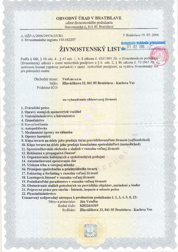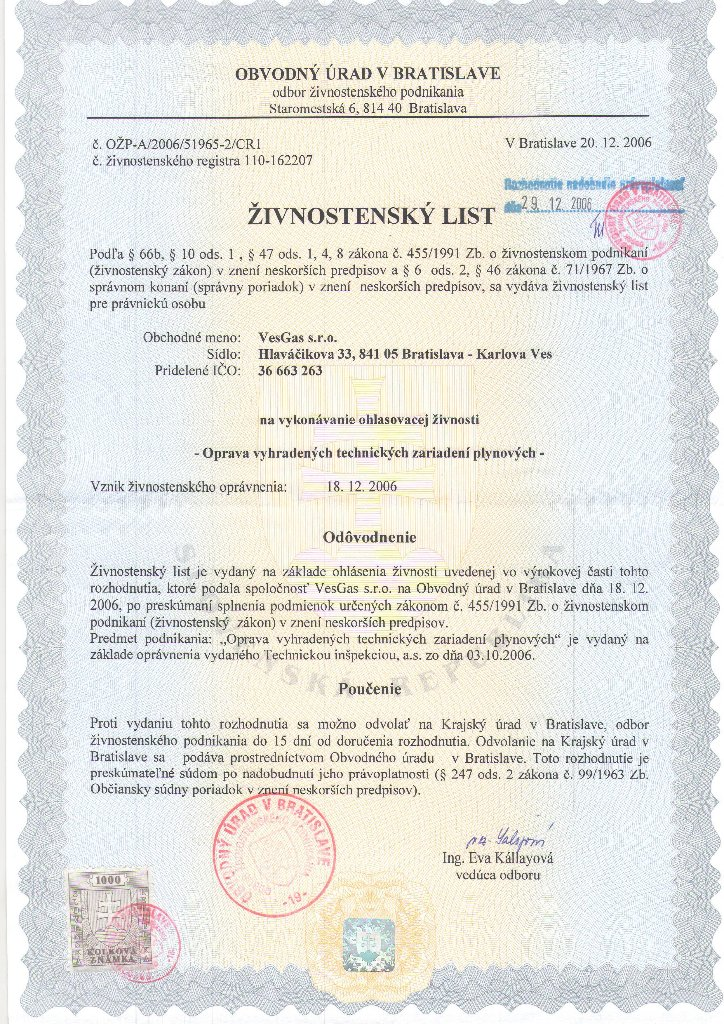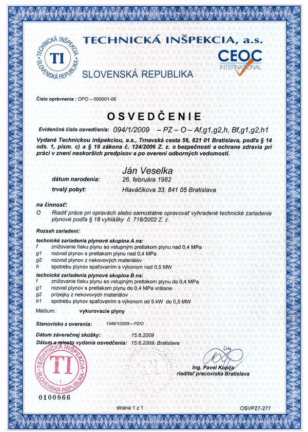 Oprávnenie "Riadiť práce pri opravách alebo samostatne opravovať vyhradené technické zariadenie plynové podľa paragrafu 18 vyhlášky č. 718/2002 Z.z."